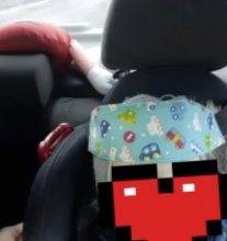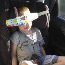 The only tricky part is if you put it on when you first get the kids buckled and they squirm around the strap will slip up and off. I have NOT had the problem of it slipping down over her face/neck. So if my husband is driving it’s easy I wait till she’s asleep then place it over her forehead. If she’s with just me, well obviously I wait till she’s asleep then pull over somewhere to put it on. Yeah that’s kind of inconvenient but her sleeping with her head to her chest just makes me cringe. I’m buying 3 more sets to give away for Christmas gifts!