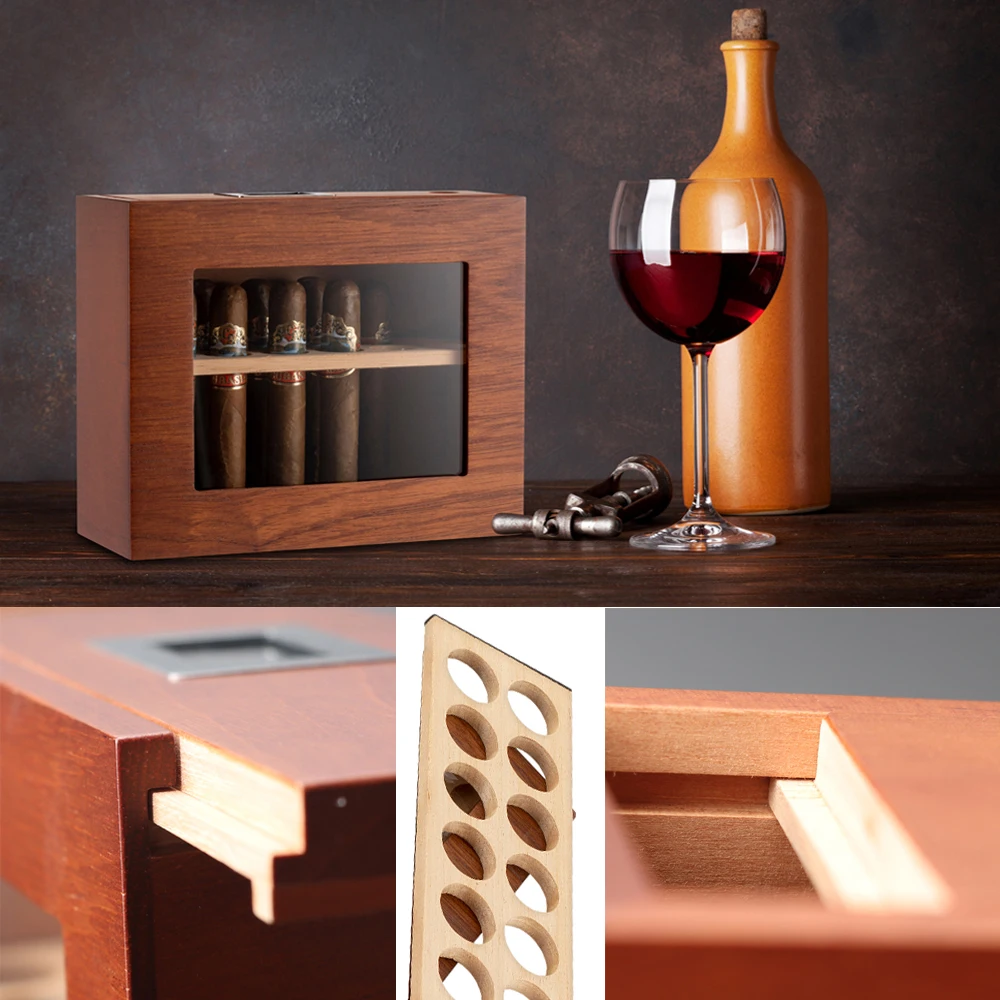 • ★Glass window design ►Standing glass window with 12 cigar slots inside, each cigar can be seen at a glance. When you want to load more cigars, you can remove the movable card slot inside, you can store more cigars. Note: As a display, you can store 12 cigars (length below 6IN, ring diameter below 60) When stored horizontally, remove the partition and store 20-25 cigars (cigars with length of 7.2IN or less are allowed).