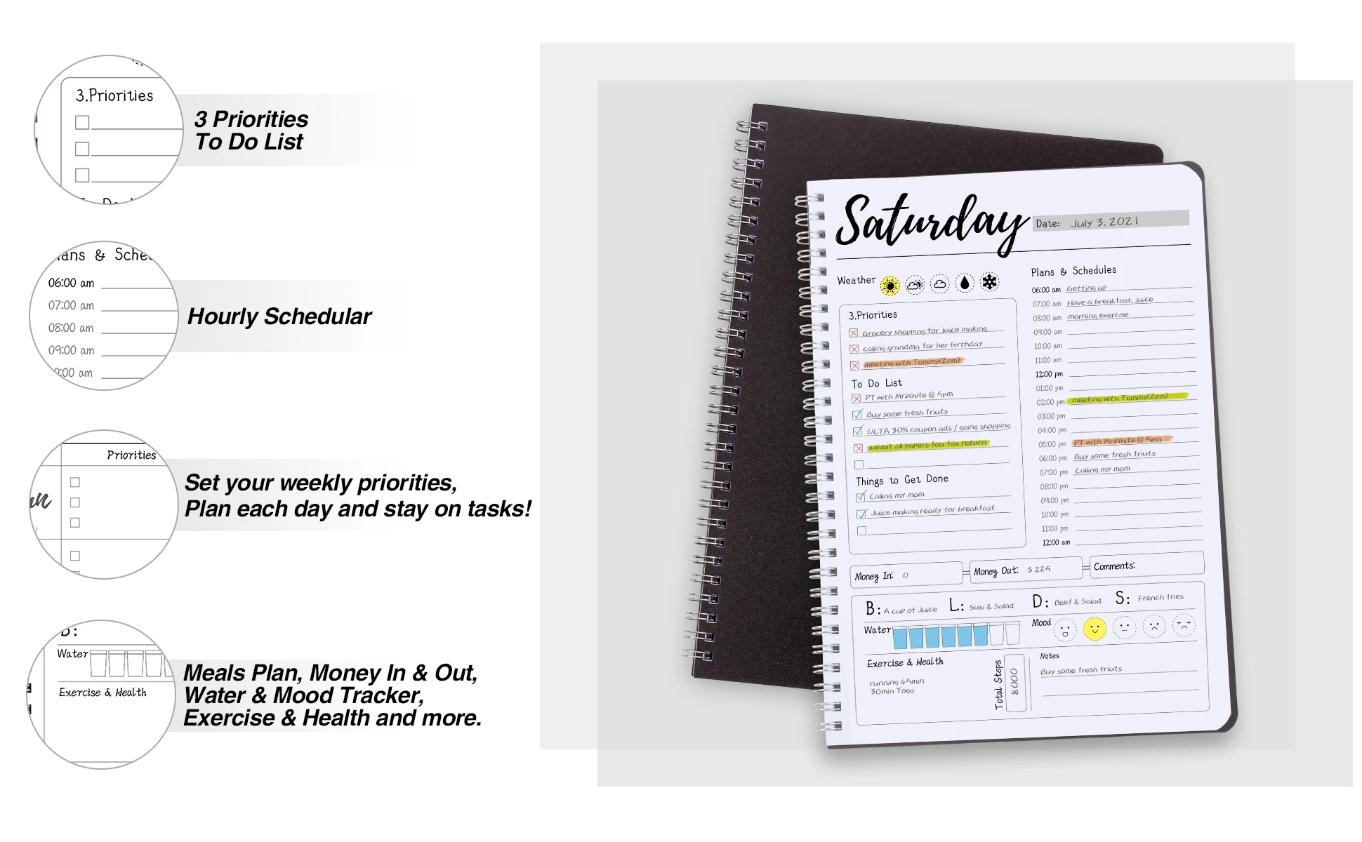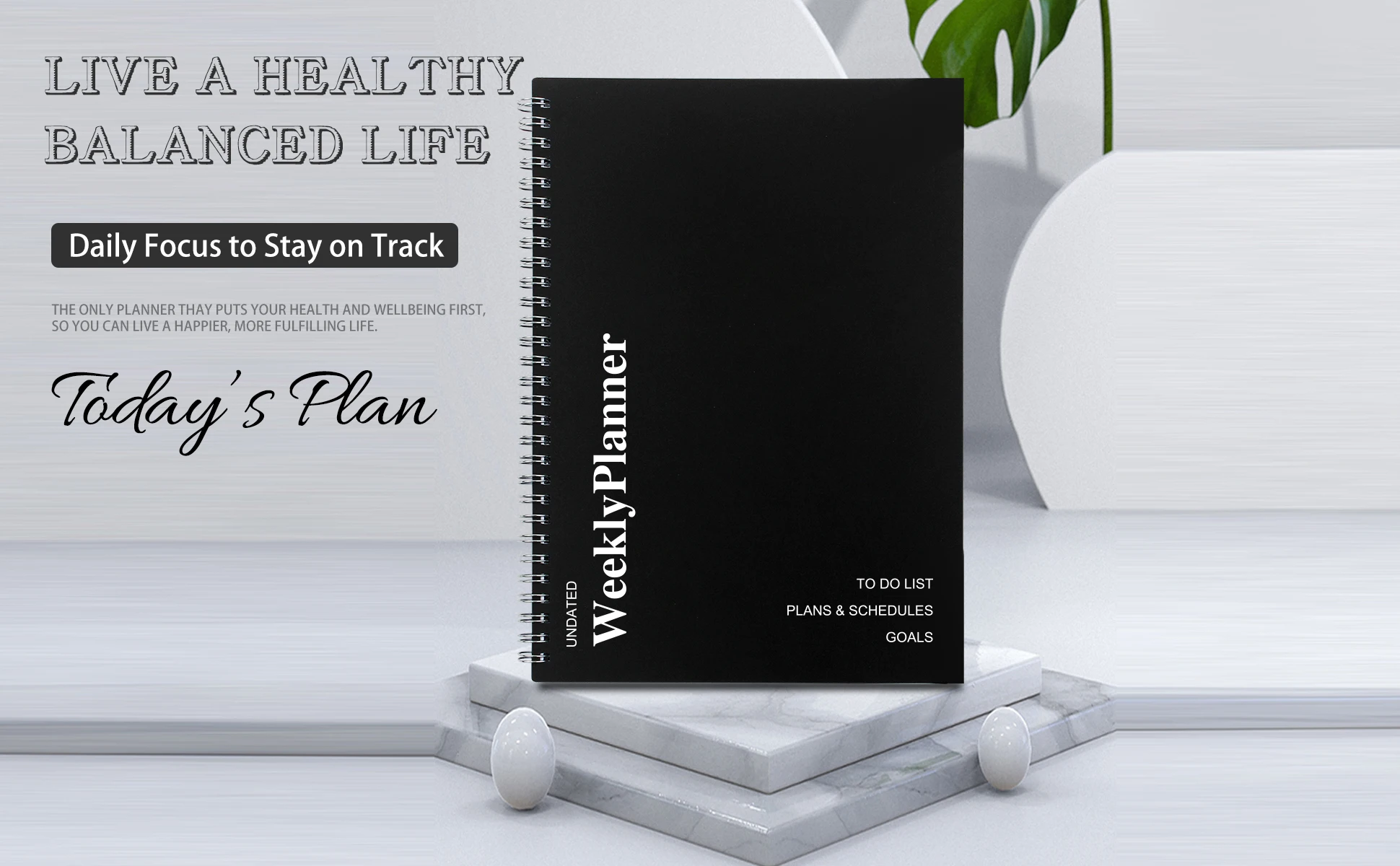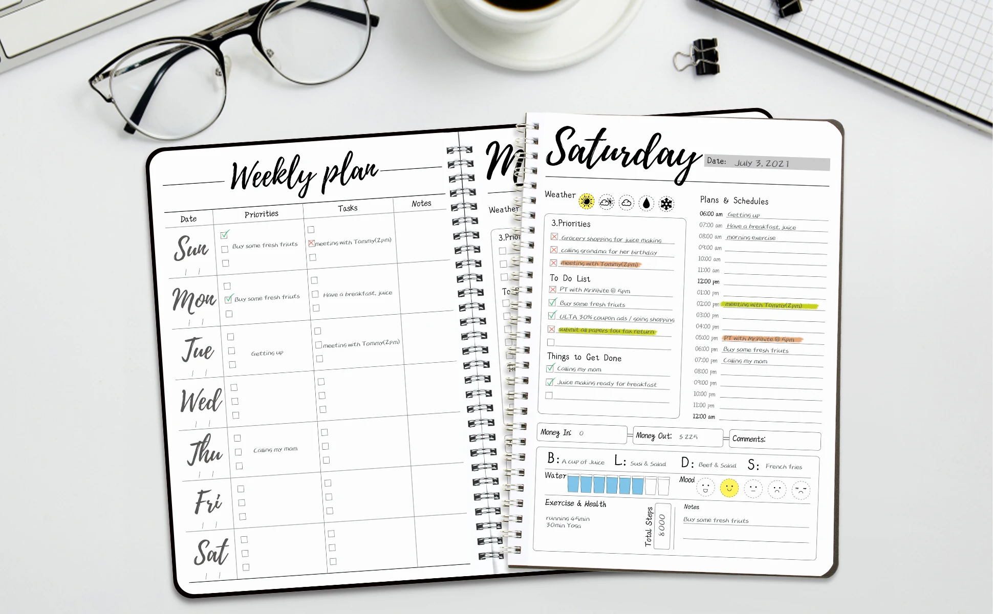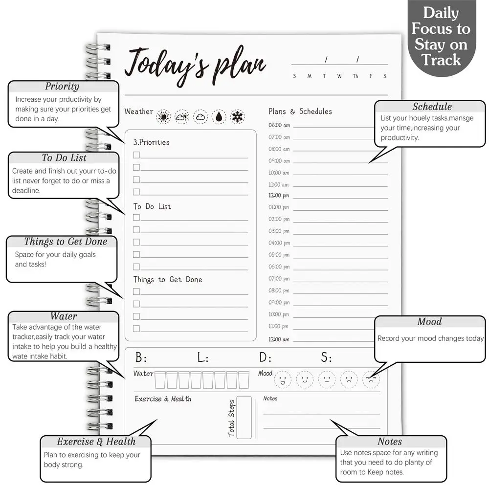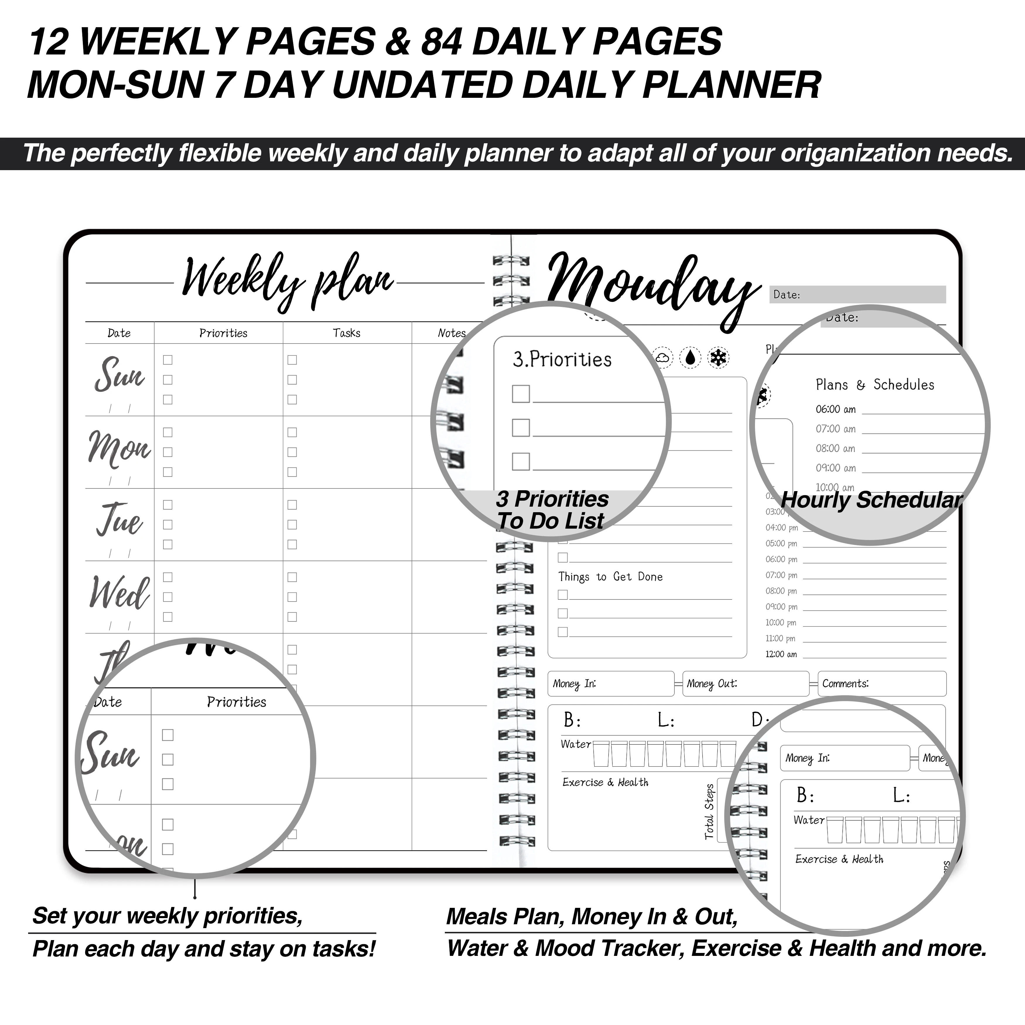 Daily Work Planner Hourly Schedule Planner Spiral Agenda Notebook Wellness Journal with TO-DO List, Priorities Flexible PVC Cover 7 Days All-Round Life Planner
