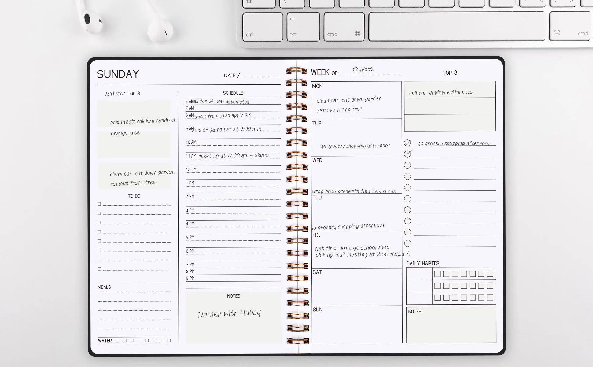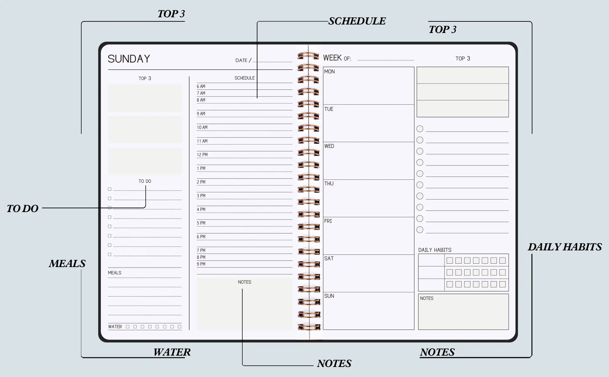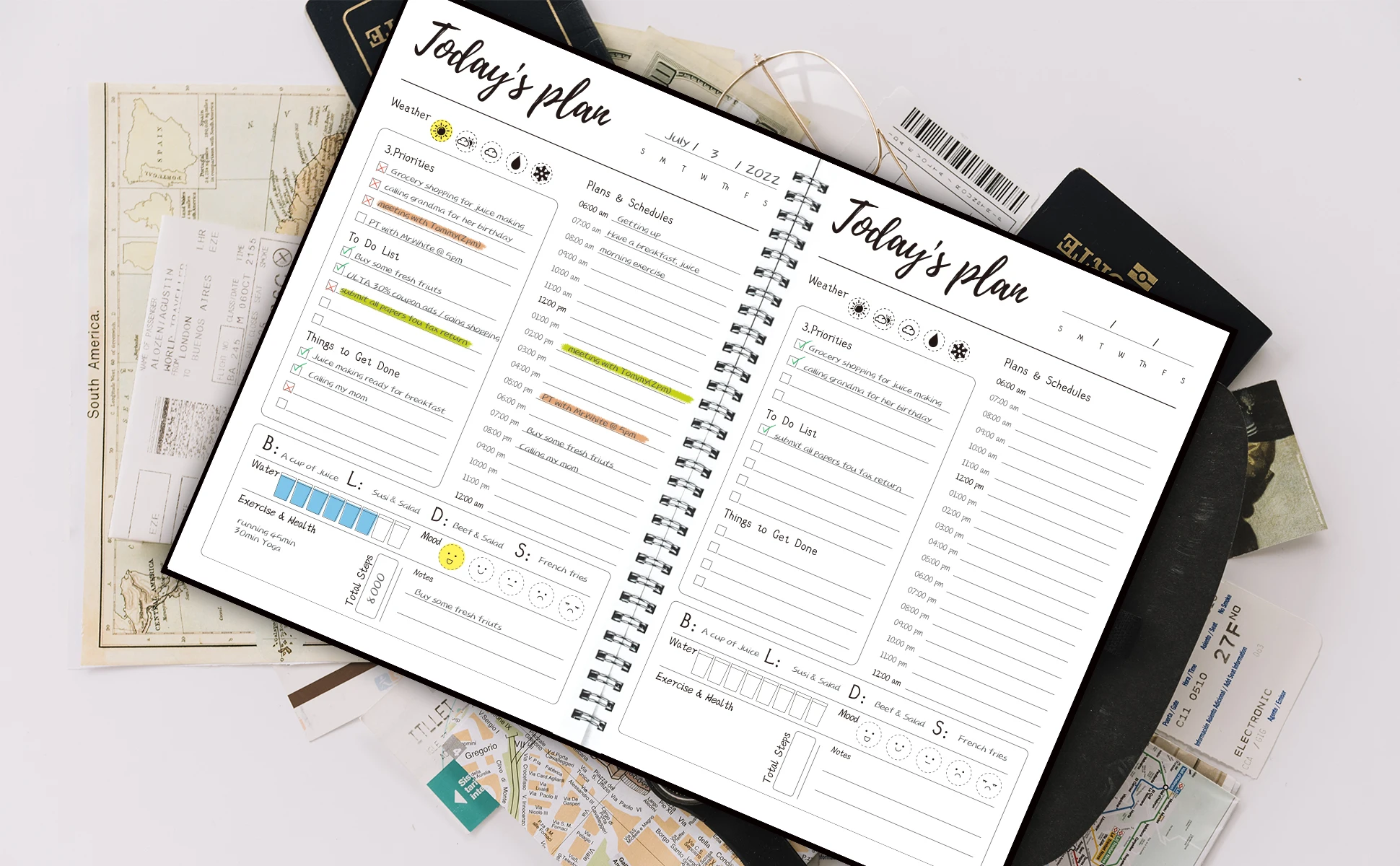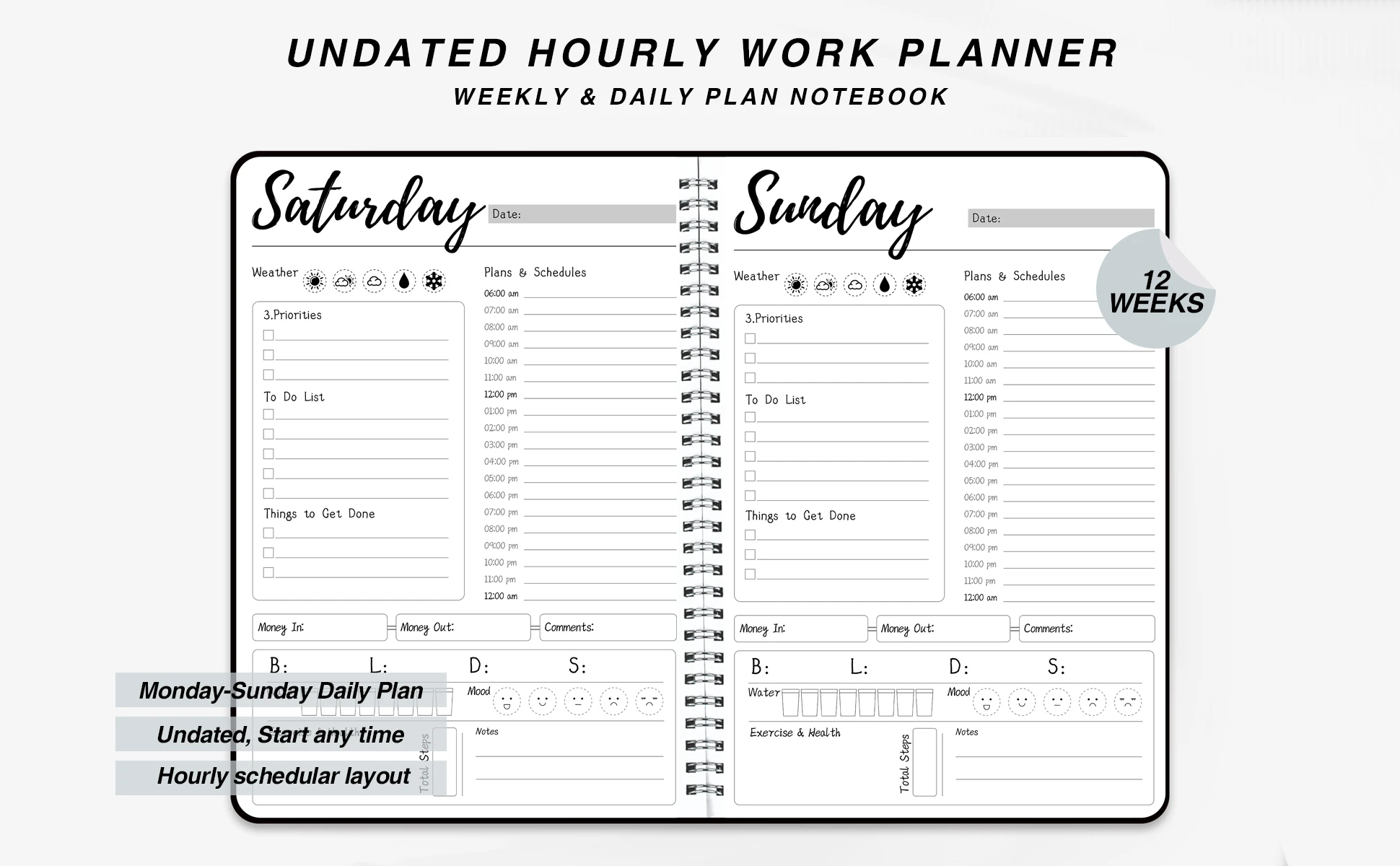 Daily Work Planner Hourly Schedule Planner Spiral Agenda Notebook Wellness Journal with TO-DO List, Priorities Flexible PVC Cover 7 Days All-Round Life Planner