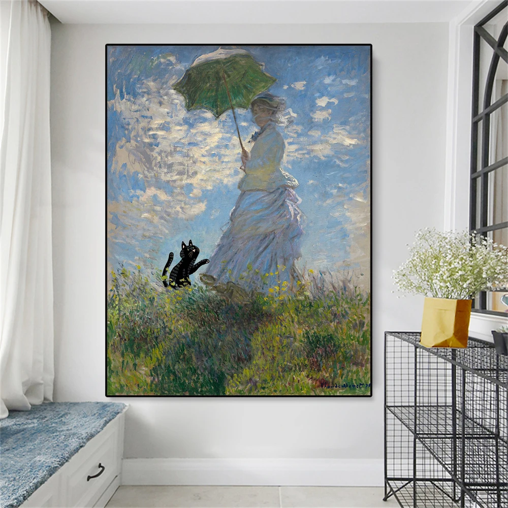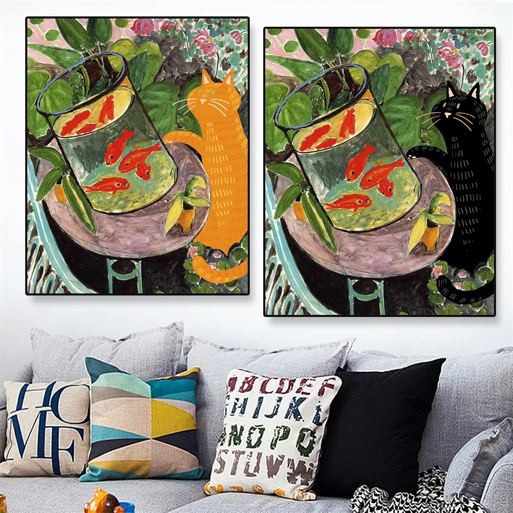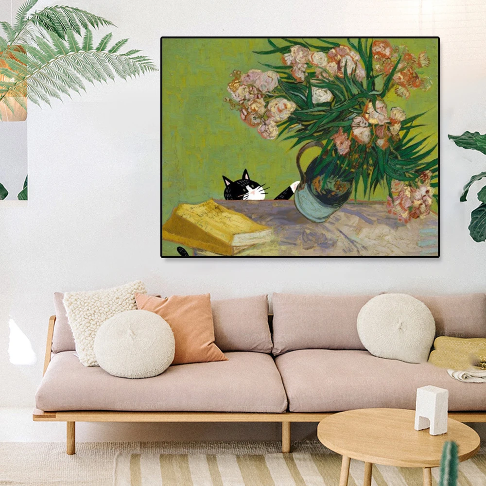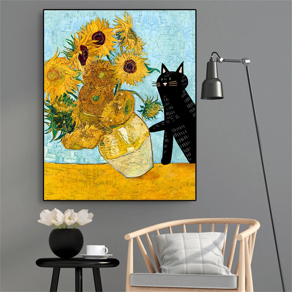 Funny Cat Art Poster Black Cat Sunflowers Print Modern