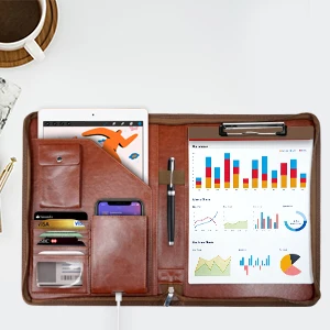1. Multiple Compartments: This padfolio has 1 A4 clipboard, 1 A4 document sleeve, 1 mobile phone pockets, 5 card slots with a ID window, 1 gadget pocket with fastener and 1 pen holder.