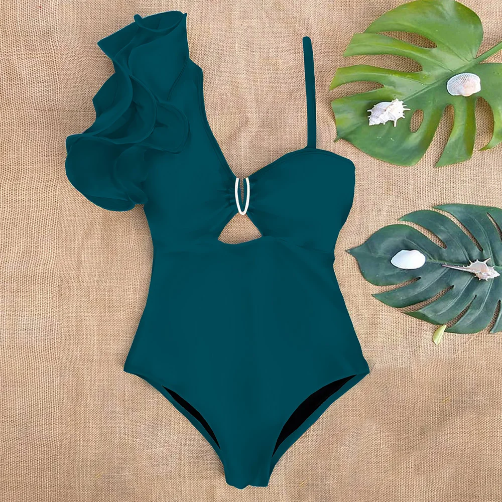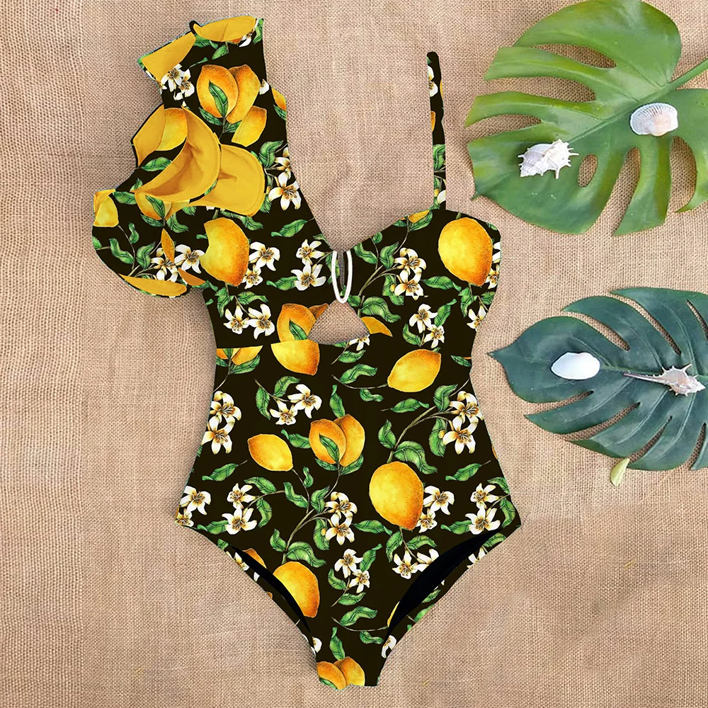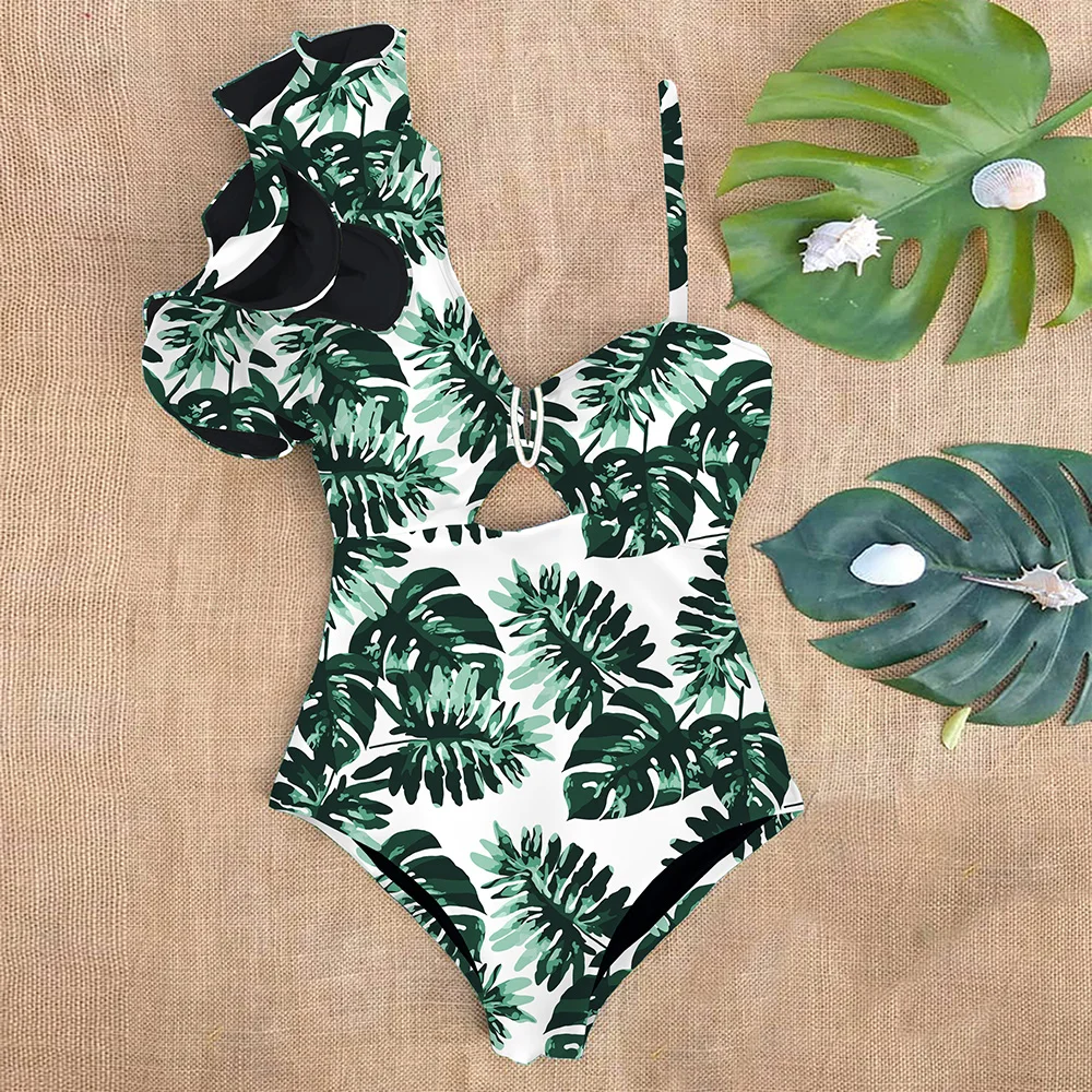 Women Swimwear Sexy One Shoulder Ruffle One Piece Swimsuit Print Floral