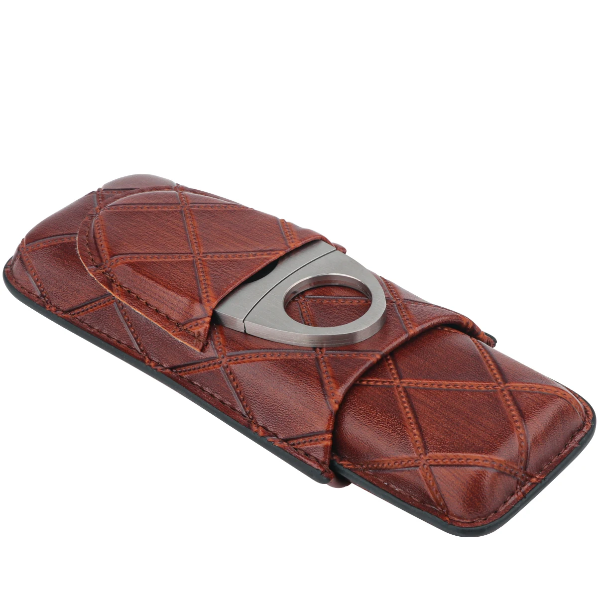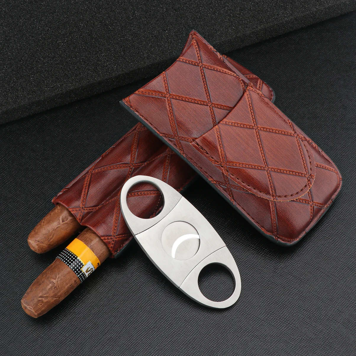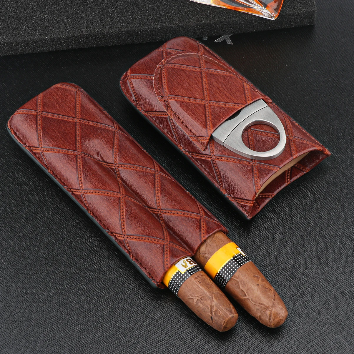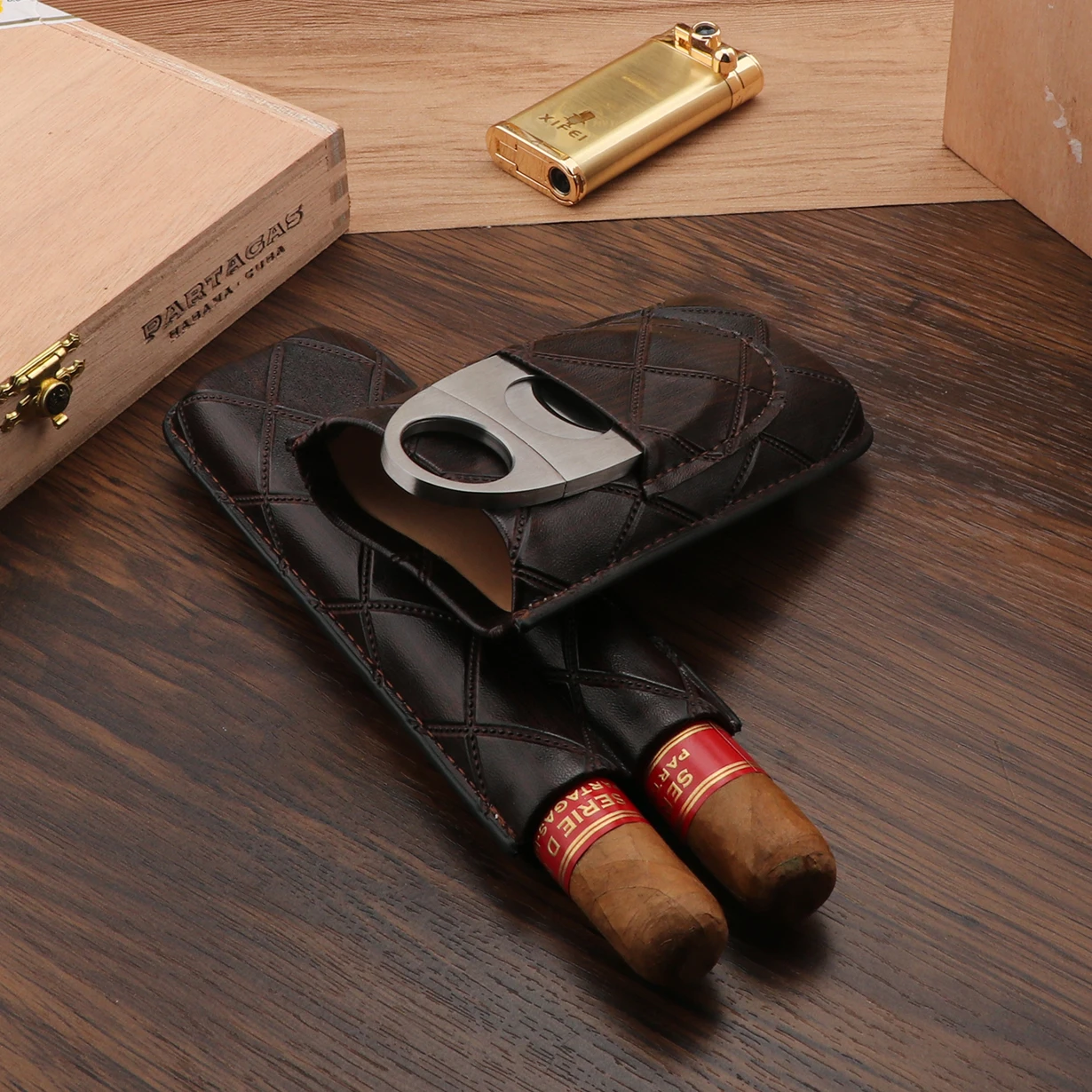 Xifei PU 2 Slots Cigar Case Set Portable Humidor Box With Stainless Steel Cutter Travel Smoking Cigarette Storage Accessories Coffee/Brown