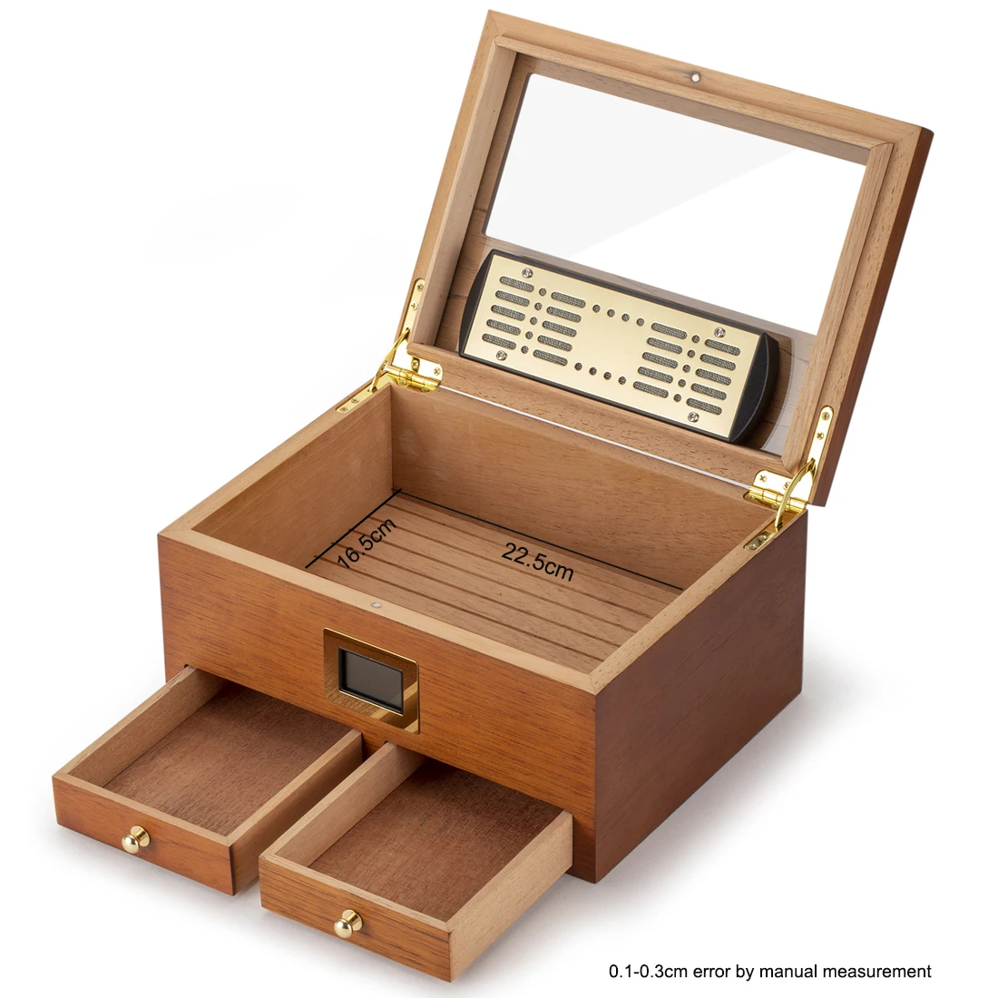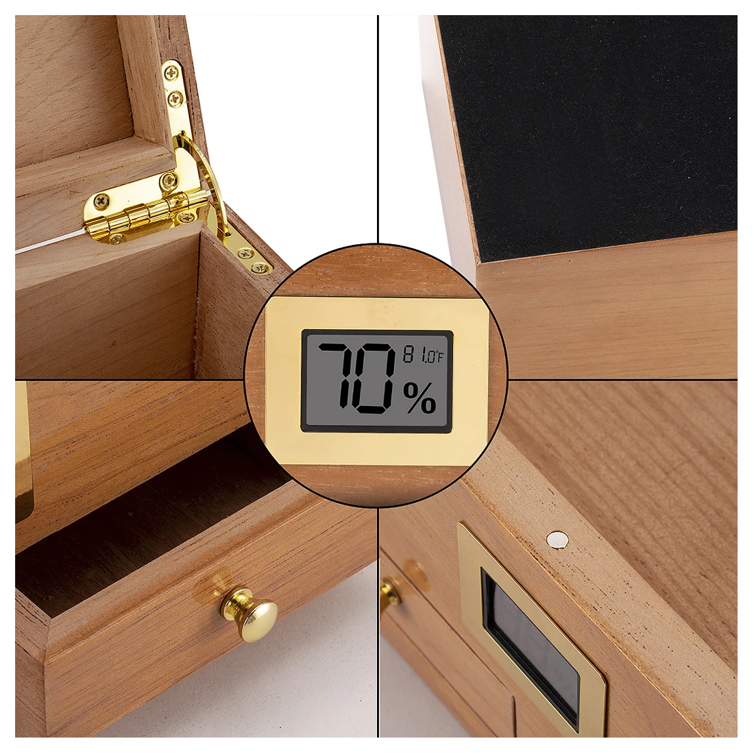Humidifier:Dedicated golden humidifier, equipped with Velcro. Add distilled water to use, keeps your humidor perfectly seasoned between 65% to 75% RH