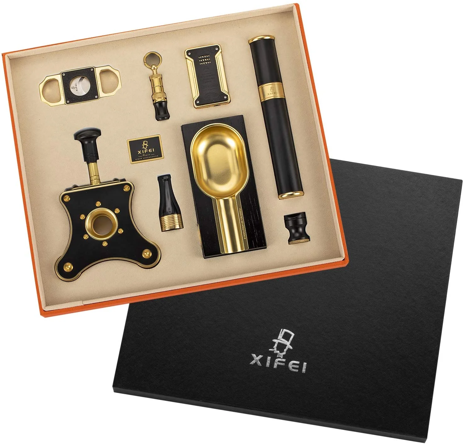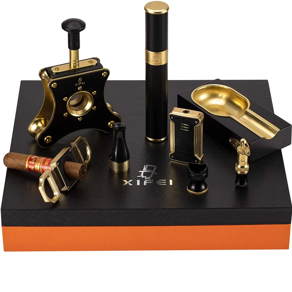 XIFEI Luxury Cigar Cutter Set 8Pieces Cigar Puncher Ashtray Tube Lighter Cigar Stander Lighter Accessories Cigar Smoking Gift Set