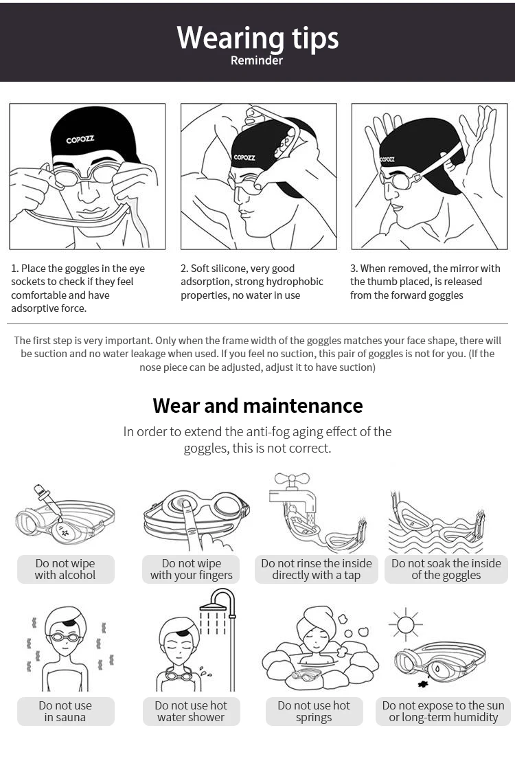5. Please allow only sight motions with your facial muscles while wearing the goggle,or the water may leak in.